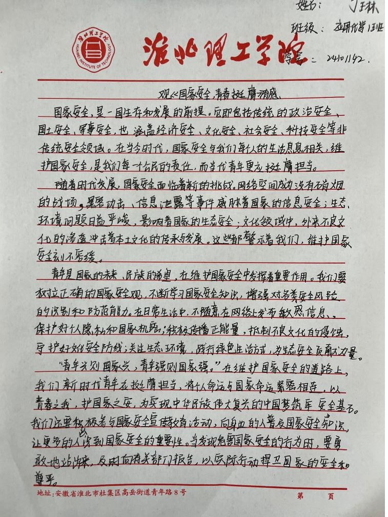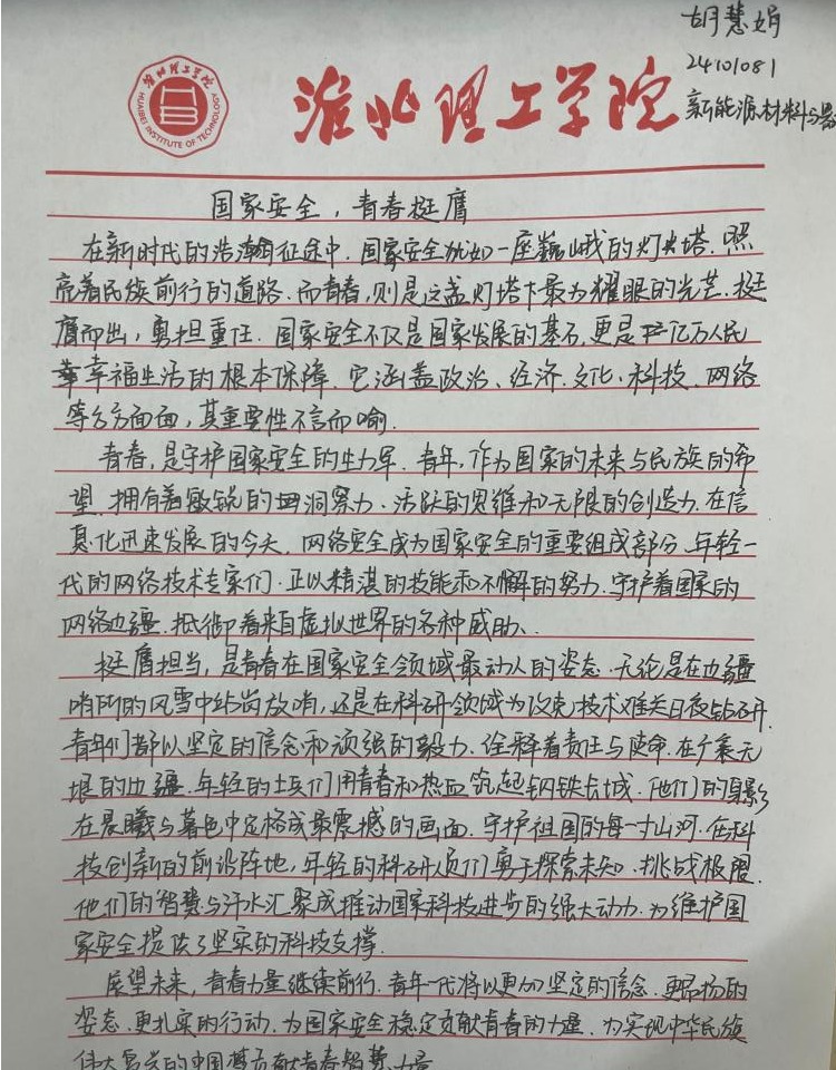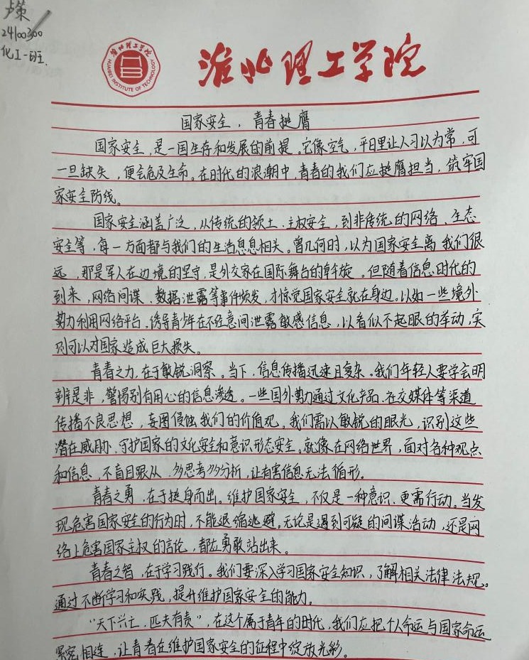 “国家安全,青春挺膺”感悟心得征集活动得到了同学们的积极响应,大家结合系列活动的参与体验,纷纷拿起笔,写下自己对国家安全的深刻感悟。有的同学在心得中写道:“国家安全是国家生存发展的基石,作为新时代青年,我们应立足专业,努力学习,为国家的文化安全和科技创新贡献力量。”还有的同学表示:“通过这次活动,我更加明白国家安全就在身边,我们要从点滴做起,自觉维护国家尊严和荣誉,以实际行动践行青春挺膺的誓言。”这些真挚的感悟,凝聚着同学们对国家安全的深刻理解和担当意识,也展现了威廉体育williamhill青年学子积极向上的精神风貌。
