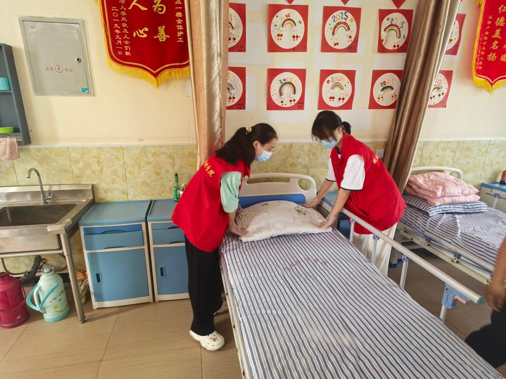9月3日下午,志愿者们携带提前准备的指甲剪、毛巾、文艺表演道具等物资抵达养老院。在养老院工作人员的引导下,志愿者们迅速分成三组开展服务:生活照料组的同学轻手轻脚走进老人房间,仔细为老人整理床铺、更换干净枕套,将褶皱的被单铺展平整,还耐心询问老人的生活需求,陪老人唠起家常;健康关怀组的同学则围坐在老人身边,一边温柔地为老人修剪指甲,一边讲解日常手部护理小知识,动作轻柔细致,生怕弄疼老人,老人们脸上纷纷露出欣慰的笑容;才艺表演组的同学在养老院活动大厅搭起临时“舞台”,歌曲《我和我的祖国》、《小手拍拍》等节目轮番上演,通俗易懂的表演引发老人阵阵掌声,不少老人还跟着旋律轻轻哼唱,现场氛围温馨融洽。