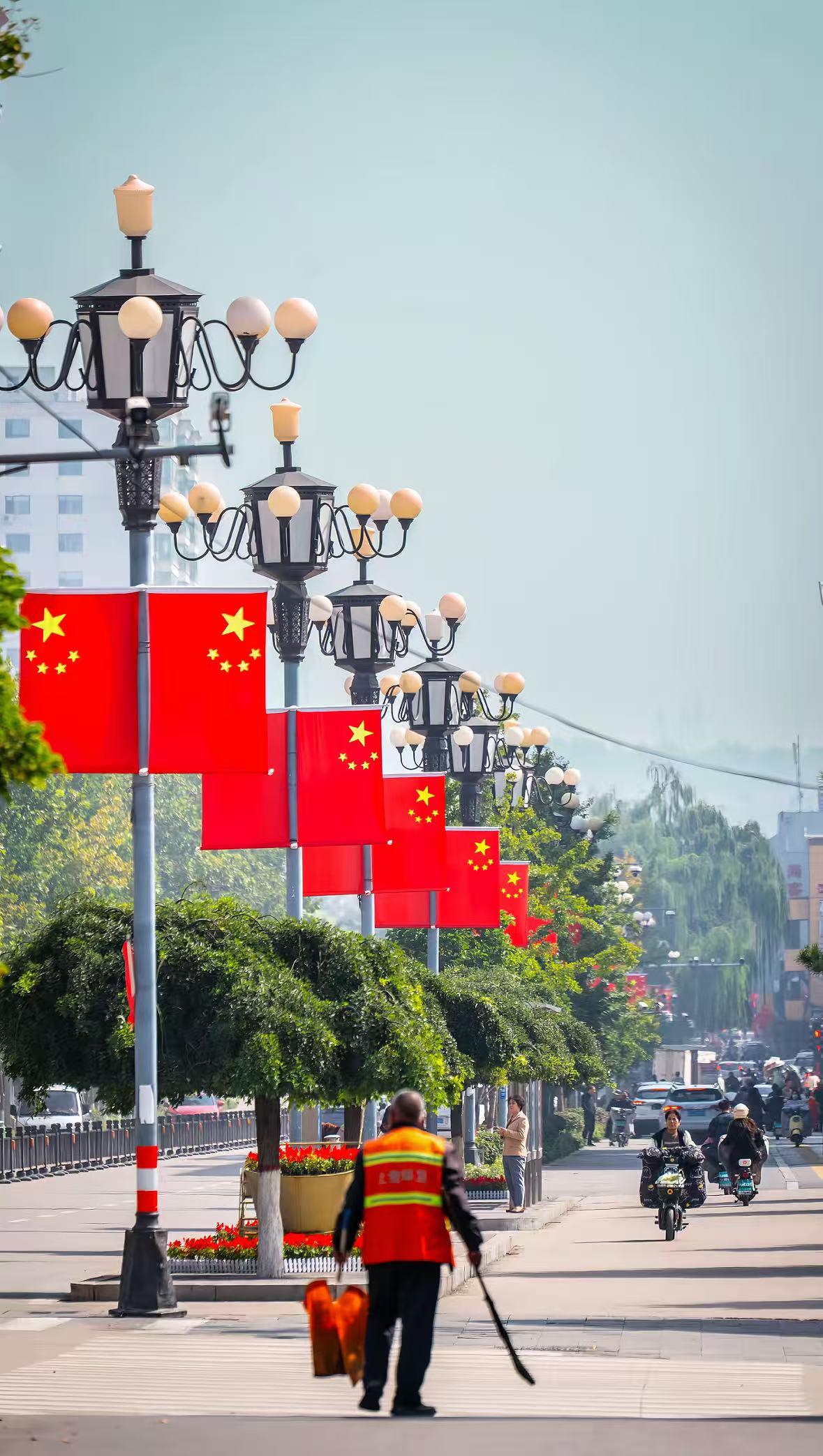 晨光里,国旗随街景铺展,让家国情怀浸润在市井生活的每一步中(2024级应用化学(对口)1班 柯韵)
